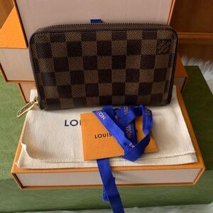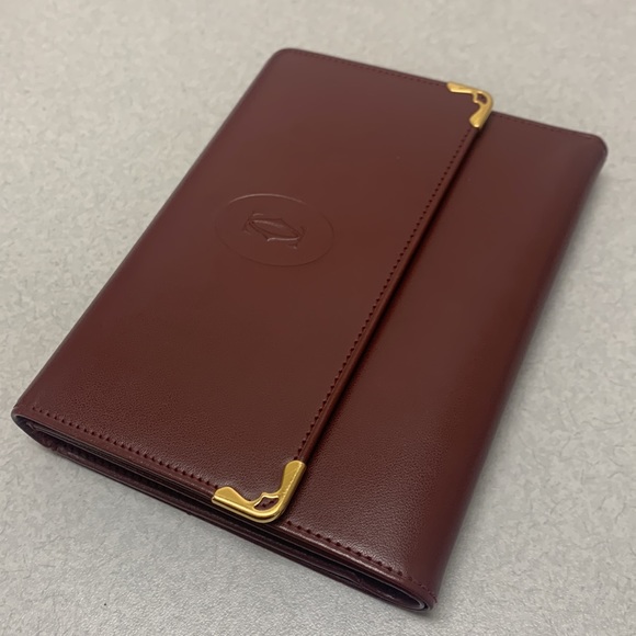This Cartier wallet is the timeless line of Bordeaux leather by Cartier. Done In smooth burgundy leather accented with gold corners.