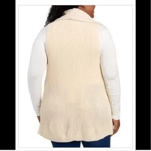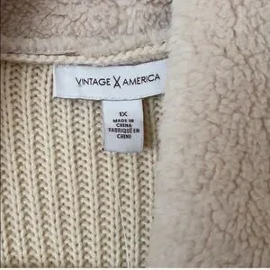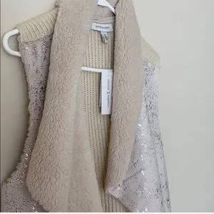 A cozy sleeveless layer from Vintage America constructed with sherpa lining, a knitted back, and metallic foil detailing across the front, creating a stylish vest option to pair with your favorite winter basics.