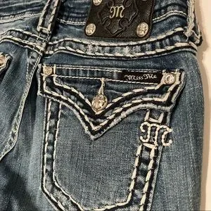 Miss Me distressed skinny jeans with rhinestone detail and button up pockets. 26x31