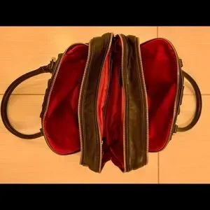 Cole Haan Black Leather Shoulder Bag with Polished Nickel Hardware and three (3) zippered sections beautifully lined in fuscia satin.