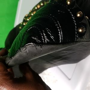 This black studded Betsy Johnson bag is a nice compliment to your wardrobe however it does have some peeling going on at the bottom as pictured but still in good shape 14 inches across the bottom 11 inches from top to bottom and 17 inches across and it's missing the pull thing for the top zipper but it still works
