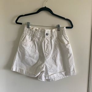These shorts are a bright white and like new. These are pull on shorts; the fly and button are not functional. Super cute paper bag / ruffle waist. Nice and wide legs.