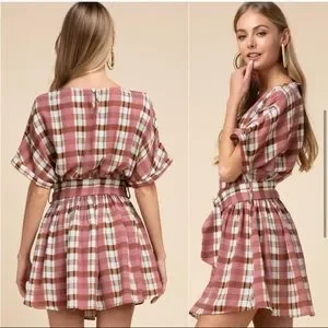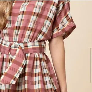 Details - plaid print, scoop neck dress, adjustable belt detail at waist, keyhole button closure in back, permanent rolled sleeves, lined, non sheer, woven, lightweight