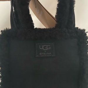 Our iconic Unisex TELFAR Bag made in collaboration with UGG in genuine black suede with a cuddly shearling trim. Bag features double strap to be worn cross-body, inlaid shearling TELFAR logo, 100% cotton lining and magnetic snap closure.