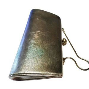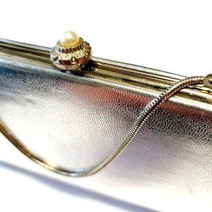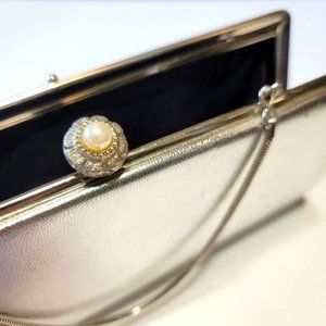 VINTAGE Glam Silver Metallic Faux (?) Leather Pearl Snap Jeweled Clutch Handbag