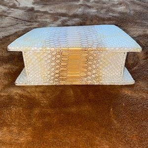 A beautiful golden yellow, snake skin embossed leather bag with matching cardholder and crossbody strap.