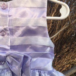 This stunning lilac dress with rosebuds is absolutely adorable! It is very full with 3 layers including a petticoat with netting! The top layer is made of 69% polyester, & 31% nylon, it is a sheer white layer with horizontal strips on it and is decorated on the front with three lilac rose buds with mint green leaves . The second layer is lilac,& 100% polyester, which has the look of satin but is easycare. The inner petticoat is decorated with white netting which is edged in lilac. It is a lilac and 100% polyester, but id much crisper than the 2nd layer, making the dress full and stand out. this dress is perfect for Spring ,& Easter egg hunting, But could be warn with a lilac or white cardigan in cooler weather & white tights, making it a versitile dress that could be worn at any time of year for that special occassion! You are sure to get compliments on your baby when it is wearing it! It compliments all skin colors with its soft pastel colors! it is .the perfect special ocassion dress for to have in your babys closet!