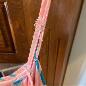 Fun pink and blue print with adjustable spaghetti straps and waist tie.
