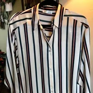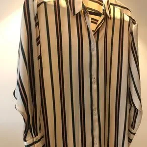 NEVER WORN - brand new. Tan blouse with navy black and cognac stripes. 100% silky flowy polyester. Three button wide cuffs and interesting button details on front. Perfect blouse for work with black linen or navy linen pants.