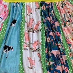 Whether it is time to plow the fields or harvest the crops, this dress will be fitting for time of year. Pair it with an undershirt or leggings for cooler weather or as is for a light summer dress. The dress features a prominent tractor and a block pattern of farm imagery. The polka-dot accents make for a delightful bow on the back and it is hemmed in yellow to give extra pop to the twirl.