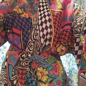 Vintage 1980's in fantastic shape. Worn 2x. Button-down front with gathered elastic cuff and pleats in back. Long extended ties hand in front. Skirt 32" long. Serious offers welcome .