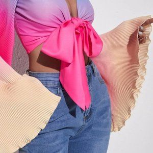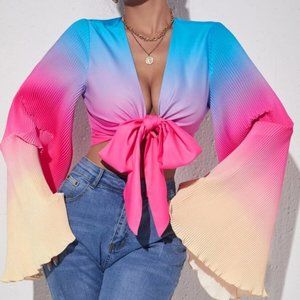 RAINBOW Print Knot Front Flounce Sleeve Top