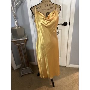BEBE Gold Satin Cowl Neck Slip Dress. Satin finish with adjustable shoulder straps. Sleeveless cowl (Draped) Neckline, midi dress, polyester. Approximately 45” Long. Size: Large New with tag