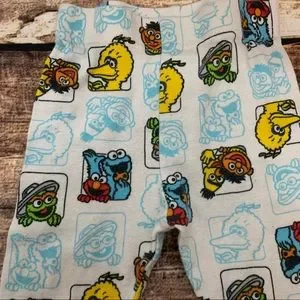 All their favorite Sesame Street Friends like Big Bird, Ernie and Bert, Oscar, Cookie and Elmo on these, loved (with minor stain) but lots of life left, in these white cotton pajamas set.