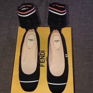 Fendi ballet flat with ankle strap. Black w/white and pink stripe. Ankle is like a tube sock/pull on. Never been worn, but right shoe was the display.