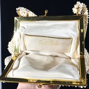 "By Lumured Corde Bead" beaded diamond pattern frame vintage purse. Goldtone frame and kissing clasp lock with a rhinestone on each. Clean, cream lining Matching change purse included!