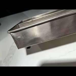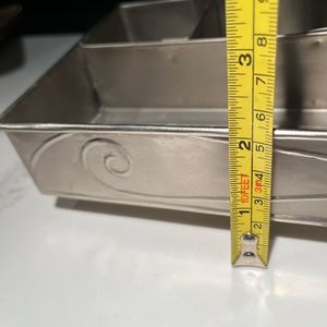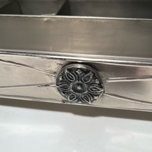 Metal organizer with four compartments. Gently loved organizer with four feet on the bottom. Lovely flower on front of the organizer. Measures 12” long x 5.5” wide x 2” tall. Weighs 10.6 ounces.