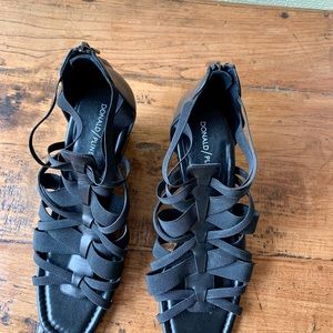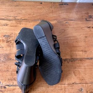 Leather with elastic straps. 3” wedge heel and backer zipper closure. Well made and no noted flaws.