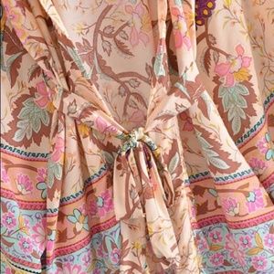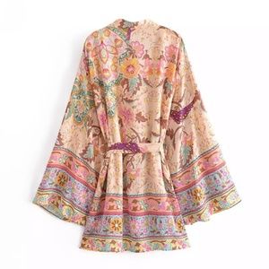Bohemian light beige multi colored floral and peacock printed short kimono style wrap. Can be worn layered for a daytime look or as a swim coverup.
