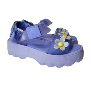 Lazy Oaf x Melissa Blue Kick Off Sandals. New never worn just been sitting in storage for a while. The PVC plastic they're made of does attract dust so they're a lil dusty from sitting but otherwise in great shape. They do have small marks on the insole but I think that may be from the manufacturer bc they haven't been moved or worn. Please let me know if you need more pics. Womens size 8