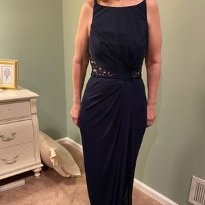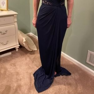 Lace mesh high neck bridesmaids dress in marine blue has speghetti straps and pleated styling into a 'V' for a very flattering look. Skirting is chiffon overlay with long slit to show leg. Worn once! See my closet for identical dress new in size 4!