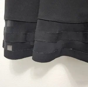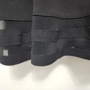 Black dress with mesh texture at the waist, and mesh stripes on the bottom hem.