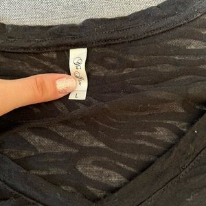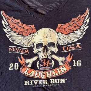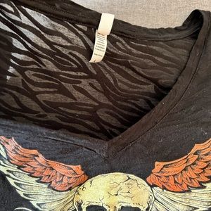 River run shirt purchased in 2016. Has a distressed zebra see through pattern. Is stretchy, runs a bit small, very form fitting. Harley Davidson type shirt. Super cute!