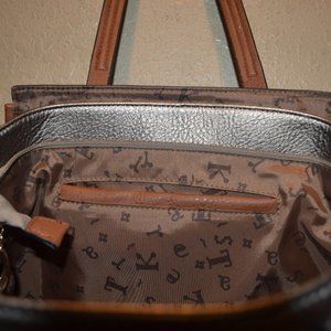 Pewter or Gun Metal Silver Purse With Cognac Brown Trim featuring Gold Studs, Cognac Straps, Gold Hardware.