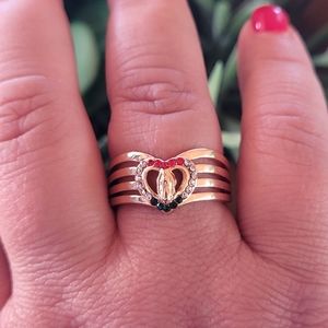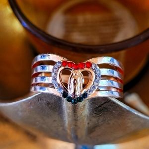 Gold plated Virgin Mary ring with red/green/white stones size 10