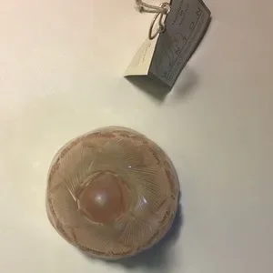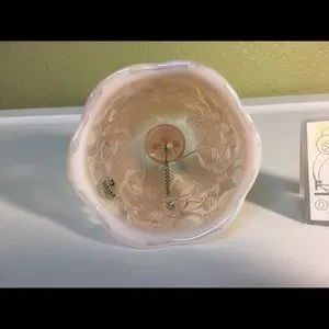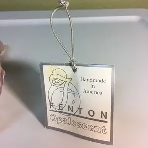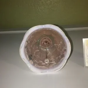 Pink Opalescent Glass, Lily of the Valley pattern, handmade in USA, measures approximately 6in tall & 3 5/8in diameter, excellent condition, No flaws seen to glass, paper sticker intact with minor wear, original hang tag included, some wear to tag with sticker residue on front, please see pictures