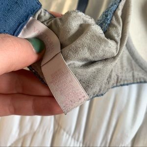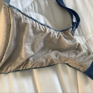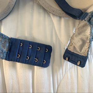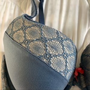 features: blue with a partial lace design overlapping a cream color. bright pink bow detail in middle of cups. padded perfect coverage style. adjustable straps. hook & eye closures.