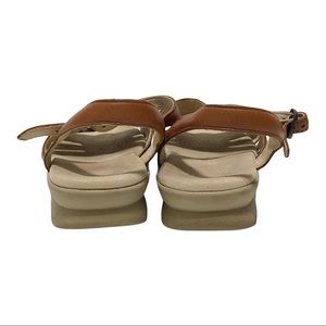 Beautiful cognac leather sandals by SAS. Soft Tripad Comfort padded footbed. Gorgeous woven top. Buckle ankle strap closure. Rubber soles. Clean and in excellent condition, with only some minor darkening of the suede footbed. Size 10.