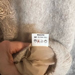 Gorgeous light taupe and light pinkish angora cardigan sweater. The sweater is fully lined on the inside so you don’t get itchy. The rhinestone buttons are so glamorous and are complimented with embroidered flowers and pearls.