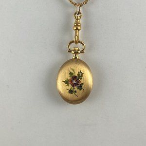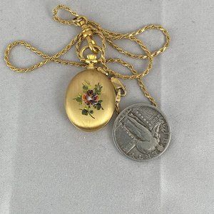 Vintage Fabulous Swiss Made Bucherer Pendant Watch 1.5x0.75 inch inch Oval Case Beautiful Pansy Flower pattern on reverse Mineral Crystal