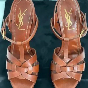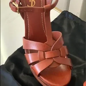 High heel stiletto sandals with intertwining straps, featuring a beveled platform covered heel and adjustable ankle straps. Total heel height is 5.3 inches with a 1.2 inches platform height. In excellent condition.They are a beautiful deep brown color. They come with dust bag.