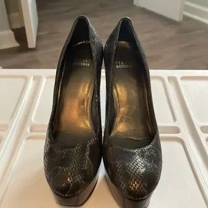 Stuart Weitzman snakeskin platform high heel. Colors are gold, gray and black
