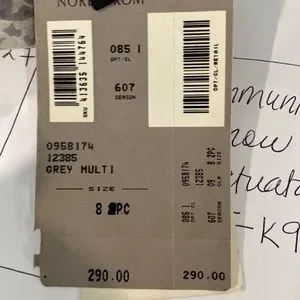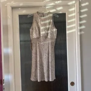Size 8 evening/ cocktail gown. This sleeveless gown has a back zipper closure. The bodice is a grey animal print covered with pearlized sequins. The skirt of the gown is an animal print chiffon over a grey chiffon. The dress was never worn. The tags are attached