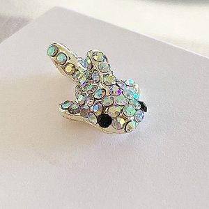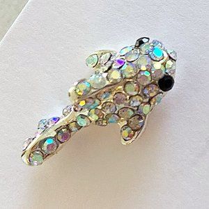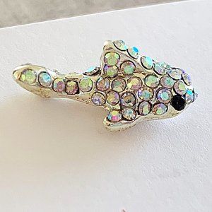 silver metallic round studded iridescent rhinestone gems adorn its body & fins