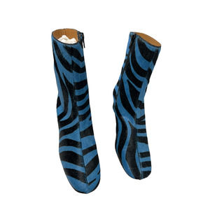 Cute pair of bright blue zebra ankle boots with an approximately 2 inch heel from by Far.