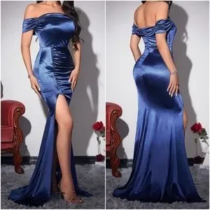 Luxurious Green Off Shoulder Slit thigh formal party evening wedding prom…
