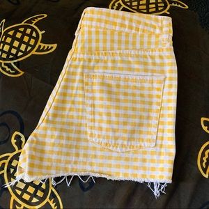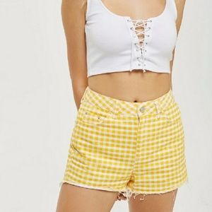Topshop Moto Gingham Denim Mom Shorts. Sunshine Yellow and White. High rise, 5-pocket, raw hem, button/zip closure, 100% cotton denim. Gently used, very good condition, no stains or tears, see pictures for details.