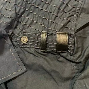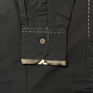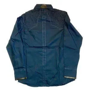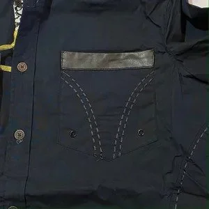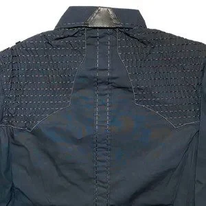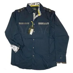 Platini Black Label men’s casual long sleeve button down shirt! Military style with thread designs from front to back. Contrast trim designs of faux leather and paisley. Navy blue, 100% cotton.