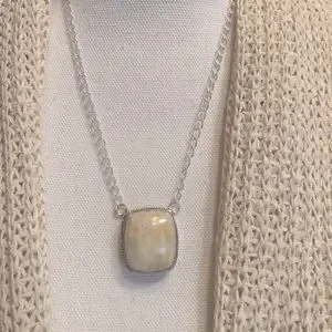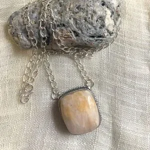 NEW Scolecite Necklace. Vintage design setting. 925 Sterling Silver stamped on the back. Beautiful large stone with colors of beige and light peach. Nice larger silver chain with this one. Scolecite is the stone of “inner peace”.