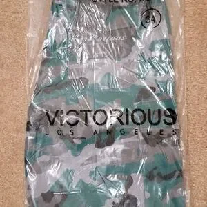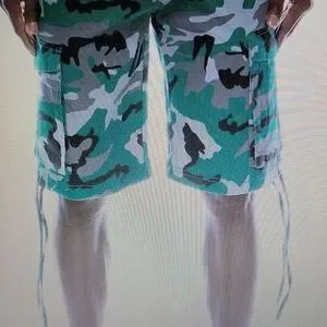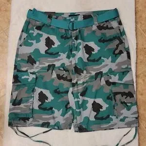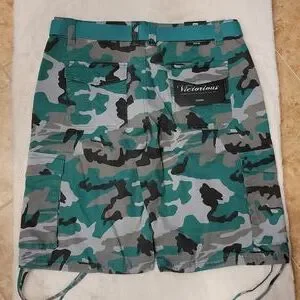 Men's Victorious Camo Belted Cargo Shorts, Cargo pockets on each side, Waist pockets, Zip fly closure, Button closure, Adjustable bottom strings, Woven belt, Relaxed fit, Green & Black, Various Sizes.