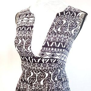 Tribal Print Deep V Sleeveless Pleated Skirt Jersey Mini Dress S