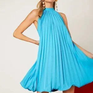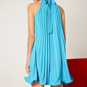 Blue Tie Back Pleated Halter Dress.
