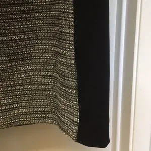 Motif print with a hint of metallic. Solid black side panels for slimming effect. Zips up the back. Lined.
