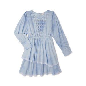 100% Cotton, Machine washable, round neck, long sleeves, lace on bodice, tiered skirt, lace trim