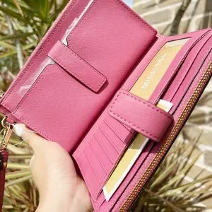 Interior cell phone pocket, ID window, 6 card slots, 2 slip pockets, 1 large open compartment and 2 zippered compartments