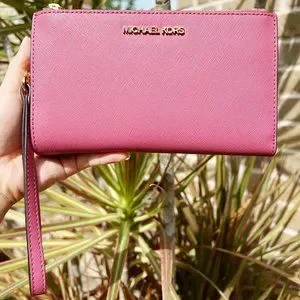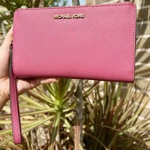 Michael Kors Jet Set Travel Double Zip Wristlet Rosewood Pink Saffiano Leather